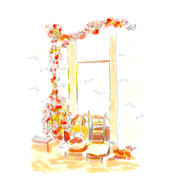 Illustration à l'aquarelle d'une femme qui lit dans un décor automnal.